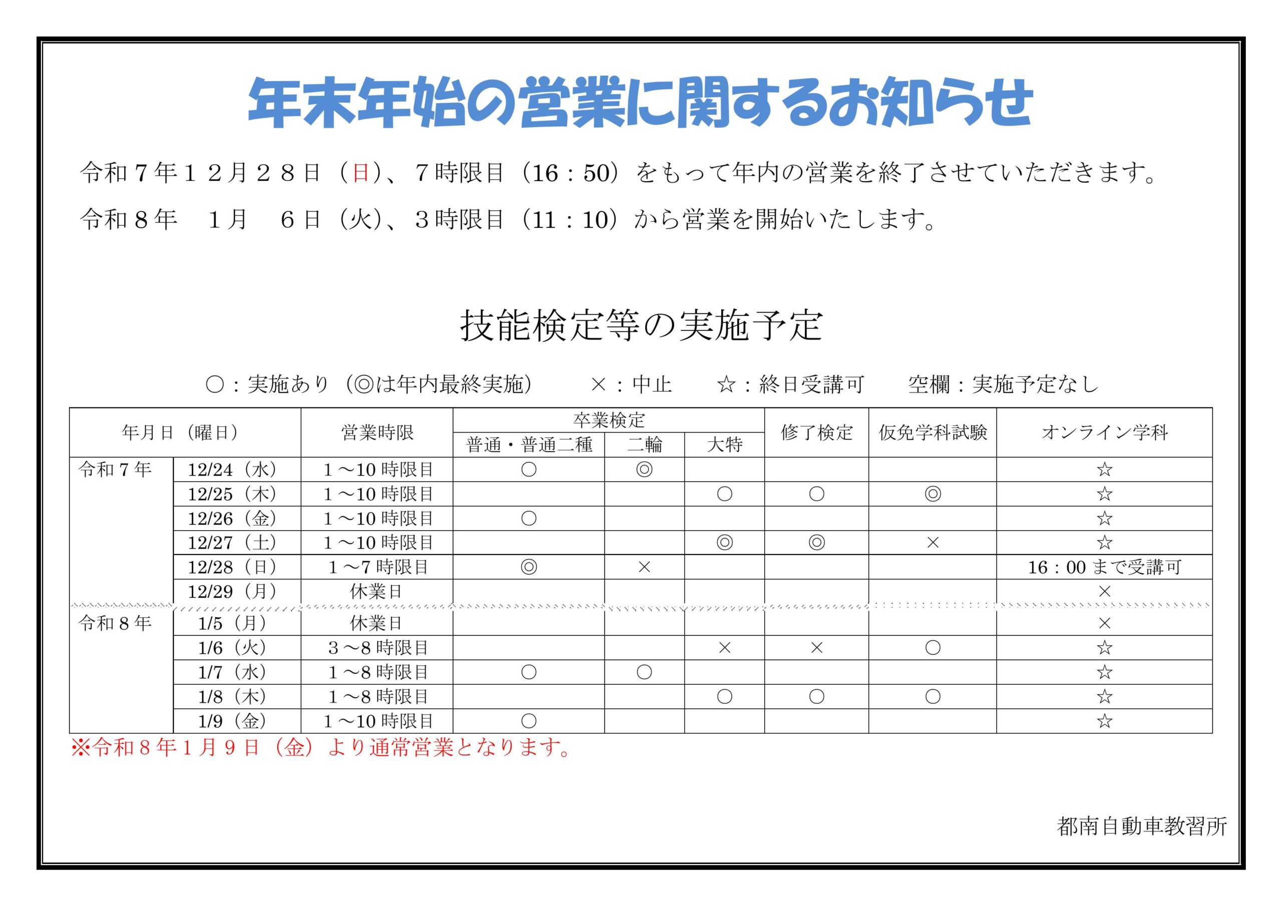 教習の年内最終営業日は12月28日(日)7時限目16:50までとなります。