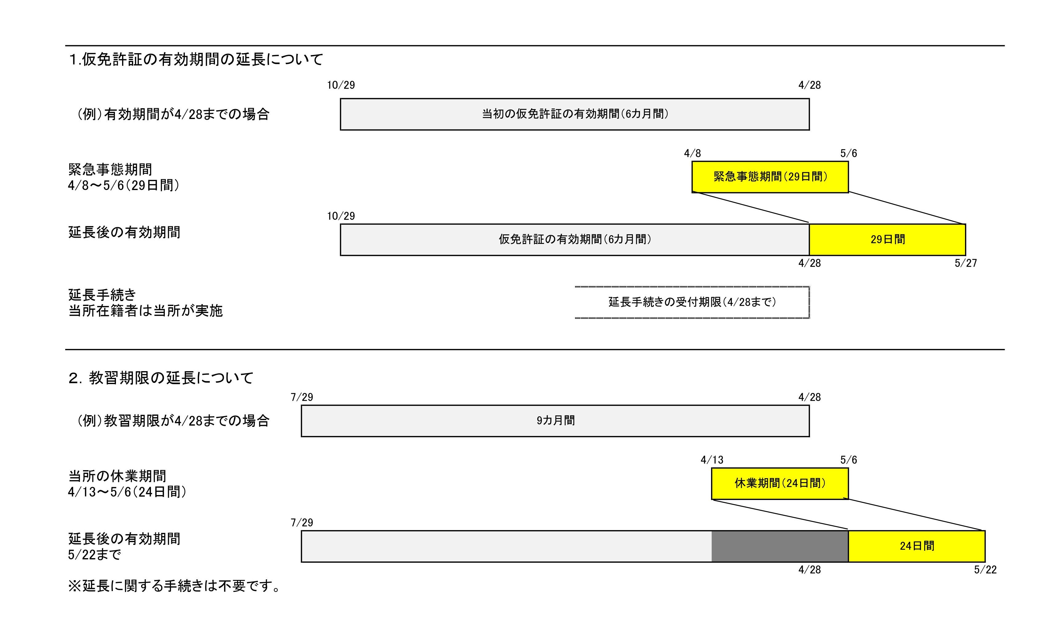 延長される期間は、当初の仮免許の有効期間が経過した日から起算して緊急事態期間(令和2年4月8日から5月6日の29日間)を加えた期間が経過するまでとなります。