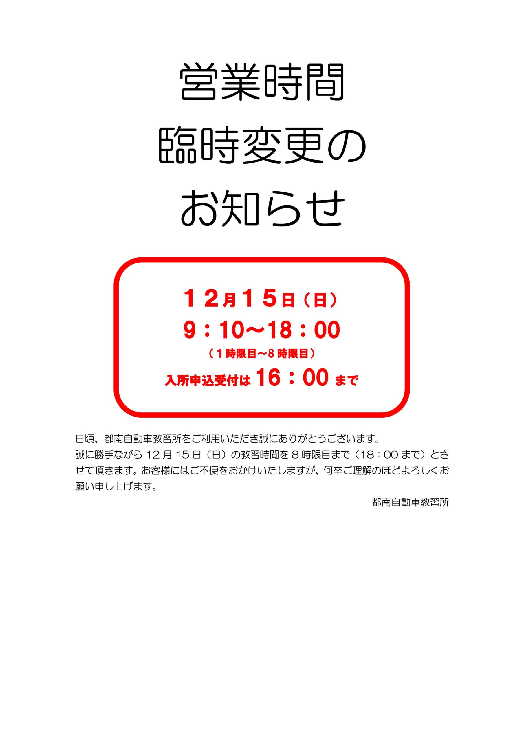 12月15日(日曜日)の教習は1~8時限目まで(18時まで)となります。