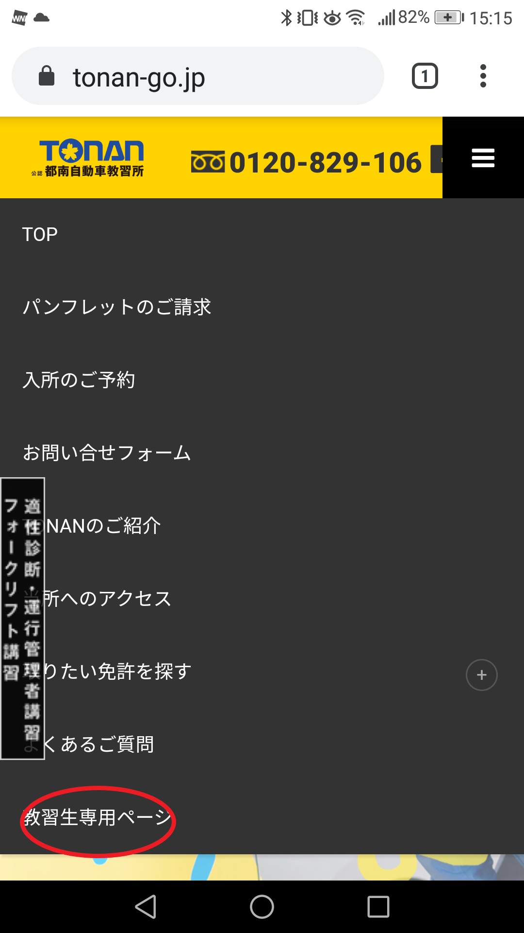 教習生専用ページは、PCなら画面上部の「教習生の方」をクリック、スマホならドロップダウンメニューの一番下にある
